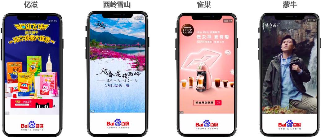百度開屏廣告有四種展現(xiàn)形式,分別是3-5s靜態(tài)全屏/非全屏樣式、動態(tài)視頻全屏/非全屏樣式、搖一搖樣式和九宮格樣式。采用全屏覆蓋的展示形式可以集中用戶的注意力,吸引用戶眼球,提高點擊率。