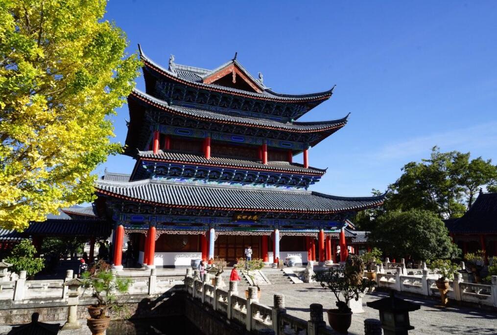 木府景區(qū)占地46畝,中軸線長369米,整個建筑群體座西朝東,“迎旭日而得木氣”。木牌坊上大書“天雨流芳”四字,乃納西語“讀書去”的諧音,體現(xiàn)了納西人推崇知識 的靈心惠性。