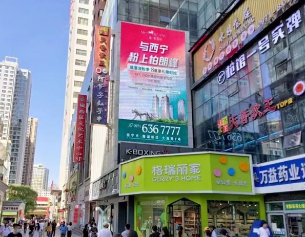 該屏位于西寧市花園北街口,湟光十字東北角恒潤大廈,其色彩飽滿,動態(tài)畫面或多幀切換效果,戶外超清P6顯示屏,畫面展示內(nèi)容更加豐滿,廣告訴求表達(dá)更為完善,強(qiáng)化廣告內(nèi)容可看性。