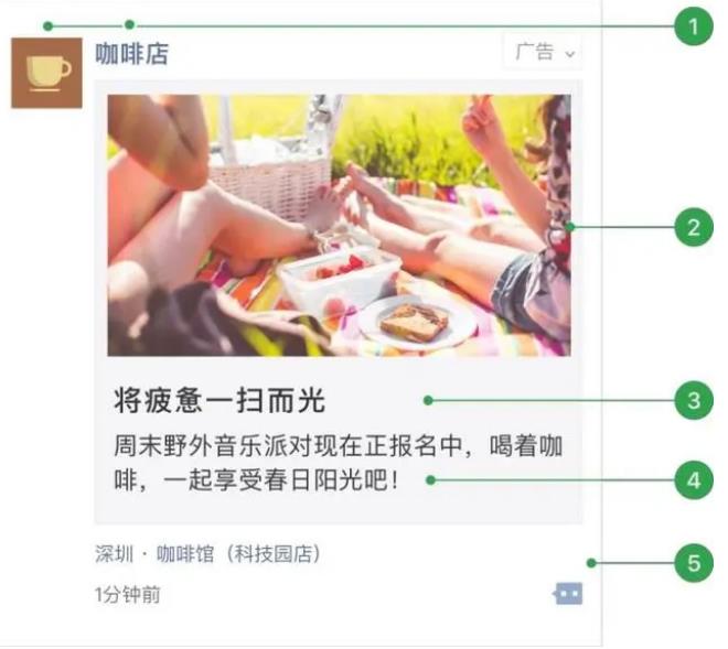 1. 廣告主頭像昵稱:用戶點擊可直接跳轉廣告主公眾號介紹頁;2. 外層圖片、小視頻;3. 外層文案標題(可選);