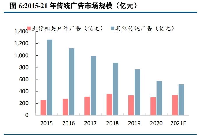 線下廣告市場規(guī)模有所回落,但結(jié)構(gòu)性機(jī)會(huì)仍存。2013-20 年全國傳統(tǒng)廣告規(guī)模自 1762 億元下降至 864 億 元,降幅為 52.7%;相較而言,網(wǎng)絡(luò)廣告自 1105 億元增長至 7666 億元,增幅 593.8%。傳統(tǒng)廣告規(guī)模的流失主 要是用戶注意力向移動(dòng)媒介轉(zhuǎn)移,表現(xiàn)為用戶上網(wǎng)時(shí)長占比提升,而其他活動(dòng)的時(shí)長占比相對(duì)下降。但居民時(shí) 間結(jié)構(gòu)上,出行相關(guān)時(shí)長占比提升,出行圈廣告可能存在結(jié)構(gòu)性機(jī)會(huì)。