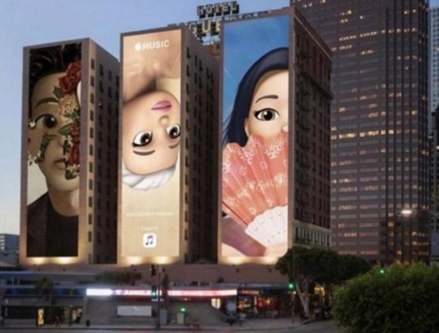 在洛杉磯著名的菲格羅亞酒店前,一套由Memoji版歌星宣傳畫組成的巨幕三聯(lián)畫布滿三棟建筑的外墻,不遠(yuǎn)處就是格萊美頒獎(jiǎng)典禮的主會(huì)場(chǎng)斯臺(tái)普斯中心。三聯(lián)畫分別是由Memoji自定義表情組成的Ariana Grande、Kacey Musgraves和Shawn Mendes,頗為引人注目。